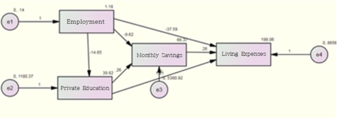 | Total Effect | Employment → Living Expenses | -64.762 | -37.592 | -27.171 | Employment influences living expenses through multiple pathways. |